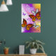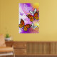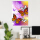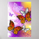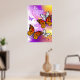 Orange, detailed monarch butterflies on light, purple, picture, painted background.