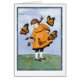 Ein kleines Mädchen schaut auf einen Kreis von Monarchen-Schmetterlingen herunter, die aus ihrer Tasche fliegen. Stehend in einem Kronenfeld, passt sie zu den Schmetterlingen in ihrem orangefarbenen Kleid mit schwarzem Trimm, schwarzen Schuhen und einem orangefarbenen und roten Band, das ihren Schwanz der Schweine Krawatte. Ich glaube, das ist die beliebteste Karte, die ich je gemacht habe.