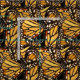 Dieses Tiergewebe-Ausrüstungsbeschreibungen ein wiederholendes abstraktes Muster eines reizenden Flügels des Monarch-Schmetterlinges (Danaus plexippus) in den Farben von Orange, von Gelbem, Gold, Schwarzes, Braun und Weiß.
