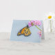 Grußkarte mit einer schönen Seitenansicht eines Monarchschmetterlinges hockte Oberseite - unten auf einer Gruppe der samenlosen Schmetterlingsbusch-Blumen, die gegen einen unscharfen hellblauen Hintergrund fotografiert wurden. Die Karte ist auf dem Innere leer, damit Sie Ihre persönliche Mitteilung schreiben.