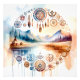 Lebhafte Aquarellbilder mit einer ruhigen Landschaft mit Bergen und einem ruhigen See bei Sonnenaufgang. Im Vordergrund stehen ein traditioneller Teepe und eine kleine Hütte, umgeben von üppigen Bäumen. Die Szene mit komplizierten Stammesmustern, darunter Träumer, Federn und geometrischen Formen, die warme Erdtöne und sanfte Aquarelleffekte enthalten, um die traumhafte Atmosphäre zu verbessern. Das Gesamtbild ruft ein Gefühl der Harmonie mit der Natur und der indigenen Kultur hervor.