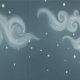 Träumende Monddarstellungen in verschiedenen Phasen, eingebettet in wirbelnde Wolken.