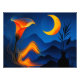 Auf der rechten Seite strahlt ein großer Halbmond in warmen Orange- und Gelbtönen und verleiht der Szene eine himmlische Präsenz.