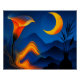Auf der rechten Seite strahlt ein großer Halbmond in warmen Orange- und Gelbtönen und verleiht der Szene eine himmlische Präsenz.