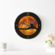 Ein schöner und einfacher Uhrentwurf mit einem großen, orange, dunkleren Braun und einem gelben Vollmond an seinem Mittel- und schwarzen Hintergrund. Die schwarze Silhouette einer starken Baumniederlassung kreuzt den Mond horizontal an seinem unteren Fach. Auf dieser Niederlassung sitzt eine Katze, auch als Silhouette, und scheinbar starrt entlang des Mondes an. Die Stundenzahlen sind auch in der orange Farbe. Eine orange dünne Linie läuft entlang den Rand der Uhr.