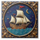 Ein Galeonenschiff mit weißen Segel und roten Fahnen, das auf einem welligen Meer unter einer sternenförmigen Nacht mit einem Halbmond segelt, alles in einem goldenen verzierten Rahmen.
