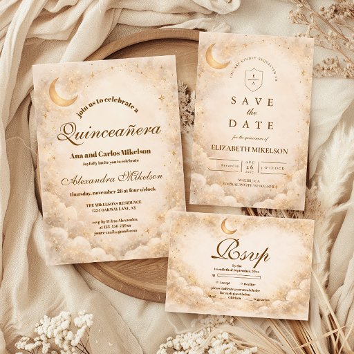 Ein leuchtendes himmlisches Design mit zarten Halbmonden und verstreuten Sternbildern vor einem warmen Pergamenthintergrund. Ein raffinierter goldener Rahmen umrahmt die Komposition, während elegante Schrift-Typografie einen eleganten Blickfang schafft, der einen so bedeutenden Meilenstein würdig ist. Die sanften Elfenbein- und Champagnertöne verleihen dem gesamten Stück einen zeitlosen, strahlenden Glanz. Perfekt für eine Quinceañera-Feier, die romantisch, erhaben und vom Sternenlicht berührt wirkt.