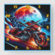 Ein schlankes Motorrad fährt eine landschaftliche Straße hinunter, flammt hinterher, Set gegen einen pulsierenden Vollmond und die amerikanische Fahne.