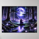 Ein einsames Mädchen steht unter einem hellen Mond, umgeben von einem leuchtenden Wald und einem silbernen Bach. Die magische Aura wird verstärkt durch glitzernde Kristalle und funkelndes Sternenlicht auf ihrem fließenden Gewand.