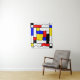 Ein einfaches minimalistisches geometrisches Design, das von der De Stijl-Kunstbewegung inspiriert wurde, mit fett schwarzen Linien und weißen, roten, blauen und gelben Quadraten und Rechtecken.