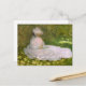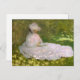 Postkarte Monet Springtime. Öl auf Leinwand aus dem Jahr 1872. Der französische Impressionist Claude Monet ist am besten für seine späteren Gemälde im Garten und in der Wasserlilie bekannt, aber seine frühen Werke sind ebenso schön und charmant. Springtime ist ein Gemälde, in dem eine hübsche junge Dame in einem rosa Kleid und einer rosa Motorhaube sitzt, die im warmen Frühlingssorn ruhig ein Buch liest. Ein wunderschönes Geschenk für Fans von Claude Monet, Impressionismus, französische Kunst und Frühjahrsmalereien.