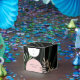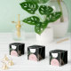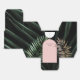Weiße und rot rosa Bögen über dem Karton inspiriert Farbschema dunkler Palmenblatthintergrund mit Monogramm in grauen und Aquarellmalbildern mit Namen und Datum.