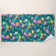 Vergnügliche tropische Bilder machen ein buntes Muster auf diesem niedlichen Strandtuch. Auf den Bildern finden Sie einen Tukanvogel, einen rosa Flamingo, eine Eistüte, Eisbars, eine helle Grapefruitscheibe und eine Zitrone, die von fetten Sternen und grünen Palmen-Blätter umgeben sind. Die mehrfarbigen, hellen Bilder werden auf einem aquamarinen, dunklen Hintergrund platziert und über die Handtuchoberfläche wiederholt. Unten ist eine passende aquamarine Ovale mit Ihrem Namen, Monogramm oder anderen benutzerdefinierten Text.