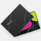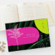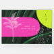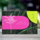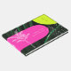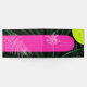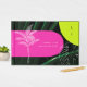 Neonrosa und gelbe Bögen auf dunklem Palmblatthintergrund mit Monogramm, Name und Datum, und zeichnend Illustrationen mit weißer Palmblattlinie.