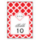 Mit Monogramm rote und weiße Vierblatt Muster Hochzeitskarten Tischnummer. Rotes Quarrefolienmuster auf weißem Hintergrund.