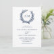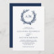 Ideal für Hochzeiten am Strand und im Wassersport, ein Korallenkranz umrahmt die Monogramme der Braut und des Bräutigams an der Spitze dieser eleganten minimalen weißen und marineblauen Einladung. Der Rücken ist massiv marineblau.