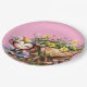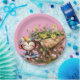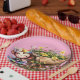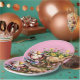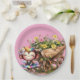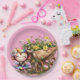 A delightful monkey ballerina, adorned in a rainbow tutu with matching rainbow-colored hair, poses elegantly before a wooden wheelbarrow brimming with vividly colored flowers.