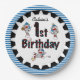 Sock Monkey Baseball 1. Geburtstag Papier Teller, ein niedliches Design, das ist gut für Kinder, die Liebe Sport, vor allem Baseball, und niedliche Affen! Es gibt drei Baseballspieler für Socken-Affen in Baseballkappen, eine, die in die Zuhause gleitet, eine für Fledermaus, eine für den Ball, eine für den Ball! Der schwarze Polka-gepunktete Text liest den 1. Geburtstag und es gibt einen Rand mit blauen und weißen Streifen und einen schwarzen dekorativen Ring. Sie können diese Socken Affen Baseball 1. Geburtstag Papier Teller leicht mit einem Namen anpassen!