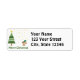 Niedlicher Affe mit einem roten und grünen Weihnachtselfenhut in einer sternigen Nacht neben einem festlich dekorierten Baum. Frohe Weihnachten!