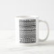 Enjoy your coffee with this striking black and white mug featuring a seamless textile sampler pattern. The design mimics stacked rows of bohemian knit and woven trims, including chevrons, waves, chains, and geometric stitching for a modern folk-art feel.