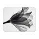 A close-up, monochrome photograph showcases a tulip flower against a bright white background. The flower's petals are delicately rendered, with visible veins adding texture. The image captures the flower from a low angle, emphasizing its upward reach. The stem is slender and dark, contrasting with the lighter petals. The overall mood is serene and elegant, highlighting the flower's natural beauty.