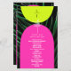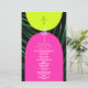 Neongelbe und rosa Gewölbe über dunklem Palmenblatthintergrund mit vertikalem Monogramm an der Vorderseite und weißer Linie Kunst Palme Art und weißer Text. Zurück ist die Kunst aus Palmblättern mit Bögen und weißem Text.