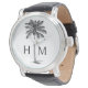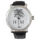 Diese moderne, an der Küste inspirierte Uhr besticht durch eine schwarze Palmenpalme mit einem Monogramm, das Sie mit Ihren Initialen personalisieren können.