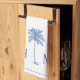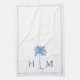 Dieses moderne Küsten-inspirierte Küchengeschirrtuch verfügt über einen blauen Palmenbaum auf Weiß mit einem Monogramm, das Sie mit Ihren Initialen personalisieren können.
