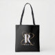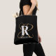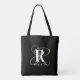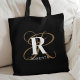 Diese moderne, individuell gestaltete Tasche aus Monogramm verfügt über ein elegantes Monogramm mit Goldschrift und einem fett weißen Initial und Namen überlagert auf schwarzem Hintergrund.