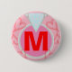 Hübscher, hellrosa Hintergrund mit roten musikalischen Noten, die sich in Herzformen bilden. Personalisieren Sie Ihre mit Monogramm Initialtexte in roter Schrift in der Mitte des platinfarbenen facettierten blauen Diamantrings. Spaß Button Button für jedes Alter. Schönes romantisches oder liebliches Geschenk. Original Design © TamiraZDesign