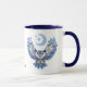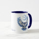 This unique and mystical mug design features a blue owl with outstretched, pattern image wings. His penetrating eyes look straight ahead and claws are outstretched. In the distance, behind and above him, is a crescent mood and silvery blue stars. The image is printed on two sides of the mug, and your name, monogram, or other text is between them. Everything stands out on a crisp white background.