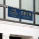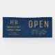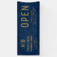 Machen Sie Ihr Unternehmen mit einem individuellen Banner mit Ihrem Firmenlogo in einem minimalistischen Gold-Monogramm-Design auffällig. Set vor einem raffinierten, blauen gemusterten Hintergrund, perfekt für Messen, Events, Schaufenster oder Büromarken. Vollständig anpassbar.