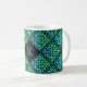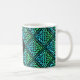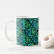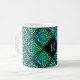 Eine Monogramm-Tasse mit einem blau-grünen keltischen Knoten wiederholten Diamantfliesen-Design vor einem schwarzen Hintergrund. Personalisieren Sie es mit Ihrem Anfang!