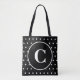 Chic reversibles Muster mit weißen Polka-Punkten auf schwarzem Hintergrund. Die Vorderseite der Tasche hat einen großen schwarzen Kreis in weiß umrissen. Personalisieren Sie Ihre mit Monogramm Initial in weißem Text. Moderne, geometrische Damenhandtasche für jede Jahreszeit. Original Designs © TamiraZDesign. www.zazzle.com/tamirazdesigns