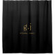 Ein modernes, schwarz-minimalistisches Duschvorhang für die Badezimmerdekoration mit einem einfachen, sauberen, modernen, minimalistischen Goldmonogramm mit einfachen Serifentypografieinitialen. Ein Satzzeichen (Periode) teilt den ersten und letzten ersten als ein einfaches Gestaltungselement auf, das diesen typografischen Stil als modern und sauber definiert. Ihr Name im Großserifentyp. Einfach, sauber und modern. Ideal für die moderne Wohnung oder Zuhause.
