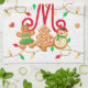 Dieses lustige, einzigartige und niedliche Design zeichnet sich durch Ihren personalisierten Namen und Ihre Monogramm und Lebkuchenelemente in Form von Weihnachtsbaum, Schneemann und ein Mädchen auf weißem Hintergrund mit rot rosa Punkten und Weihnachtsbeleuchtung Dekoration aus. Dieses Küchentuch ist ein ausgezeichnetes Geschenk für Ihre Familie und Freunde.