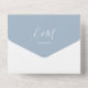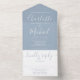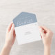 Alles in einer Hochzeitseinladung mit elegantem Signatur-Script-Namen und Monogramm-Initialen auf einem staubigen blauen Hintergrund. Die Einladung enthält eine perforierte RSVP-Karte, die für Sie individuell adressiert oder links als leere Karte für die Handschrift der Adressdaten Ihres Gastes verwendet werden kann. Entwickelt von Thisisnotme©