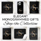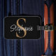 This personalized black luggage tag features elegant script typography and a gold monogram. It is easily customizable.
