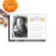 ** Foto Credit: Fotografie © Storytree Studios, Stanford, CA ** / Ein smart Erntedank Thema Foto Geburtsankündigung Karte Design mit klassischen Orange-Weiß Kürbis und ein Wappen Form mit Platz für einen Single Buchstaben Monogramm. Die Aquarellelemente wurden ursprünglich von mir auf 100% Baumwollpapier handgemalt, bevor sie gescannt und digital arrangiert bzw. gestylt wurden (das Wappen wird von einem anderen Künstler geformt). Die Rückseite hat Platz für ein vollflächiges Foto. Wenn Sie kein weiteres Foto auf der Rückseite benötigen, können Sie dieses löschen, um ein blaues und weißes griechisches Schlüsselmuster zu zeigen, das von mir digital erstellt wurde. Sie können die Kontrastfarbe auf der Rückseite (derzeit dunkelblau) ändern, indem Sie die Hintergrundfarbe auf der Rückseite ändern (klicken Sie, um sich unter dem Bereich für die Textanpassung weiter anzupassen. Das bringt Sie in das Designwerkzeug.