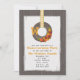 Eine Party Einladung mit einer Illustration eines mit Monogramm Fallthemenschadens. Der Kraut ist mit roten, gelben und orangefarbenen Rosetten versehen und hängt an einem orangefarbenen Zickzack Band. Hintergrund ist Stallholz . Personalisieren Sie den Kranz mit dem Brief Ihrer ersten. Personalisieren Sie den Text mit Einzelheiten Ihrer Veranstaltung.