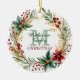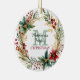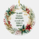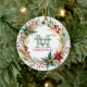 Hier ist ein wunderschönes personalisiertes Ornament für die Weihnachtsfeiertage der Familie. In der vorderen Mitte befindet sich das Monogramm in hellgrün, der Familienname ist dunkelgrün darüber geschrieben und CHRISTMAS in rot. Die Gruppierung ist gerahmt mit einem hübschen heiligen und poinsettia Aquarellkranz Weihnachtskranz. Auf der Rückseite des Ornaments befindet sich das gleiche Kranzbild mit dem eigenen Text in Grün.