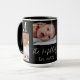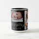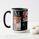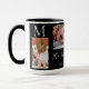 Auf dieser stilvollen schwarzen Tasse ist ein Monogramm Buchstaben in der Ecke, in 3 Fotos mit dem Text in der Mitte mit Familienname und Datum, wo Sie nach Ihren Wünschen mit Ihren eigenen Fotos und Familiennamen anpassen können.