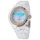 Eine mit Monogramm Uhr mit einem Foto einer klaren, blauen Ozeanszene mit sanften Wellen an einer Küste und weichem braunem Sand. Ein blauer Himmel mit flauschigen Wolken in der Ferne. Serene tropische idyllische Jahreszeit.