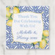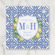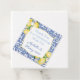 Lebhafte Aquarelllemonen, ergänzt durch ein Vintages Azulejo-Fliesenmuster mit Text in klassischem Kobaltblau und hellblau. Eine Seite enthält eine Nachricht und die Namen der Paare. Auf der Rückseite ist ein Wappen mit Initialen, Namen und das Datum der Veranstaltung.