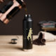 In dieser Getränkekarte befindet sich ein goldener Tennisspieler mit Silhouette, der gerade dabei ist, den Ball zu treffen. Ihr Monogramm in passendem Gold wird durch dünne Goldlinien gerahmt. Dieses Design sieht am besten auf der schwarzen Flaschenfarbe aus.