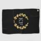 Dieses Golfhandtuch wird mit einem goldenen Lorbeerkranz auf schwarzem Hintergrund mit kundenspezifischen Monogramm-Initialen in Weiß gezeigt. Passen Sie dieses Element an, und ändern Sie die Monogramm-Initialen auf das eigene.