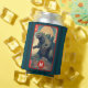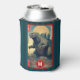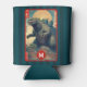 Take your outdoor celebration up a notch whenever you relax with your favorite beverage while using this cool, striking, unique, custom monogram can cooler A retro vintage, green blue lizard monster appears over a landscape with mountains, pagoda and a fan sun. The background sports teal blue stripes. Add your personal initial. Available in 3 sizes: can, slim seltzer can and bottle. Makes a fun and bold statement every time you use it. Sure to add extra fun to your summer event!