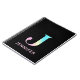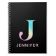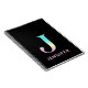 Chic personalisiertes schwarzes Notizbuch mit einem "J"-Initial-Monogramm in fett gedruckter Form mit einem rosa, gelben, minzgrünen und aquamarin blauen Regenbogenverlauf. Fügen Sie unten Ihren Namen in einfacher rosa Typografie hinzu.