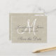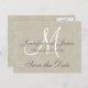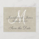 Elegante Monogram Linen Save the Date Postkarte. Elke Clarke© für MonogramGallery bei Zazzle. Moderne, einfache Hochzeitsankündigung mit bedrucktem Beige-Leinen-Foto-Effekt. Ein weißes Monogramm, das in der Skripttypografie mit grauem Text-Overlay initialisiert wurde. Vollständig anpassbar. Weitere Farben und Hintergrundeffekte sind verfügbar.