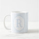 This elegant monogram mug features a soft blue and white striped design with the letter R in the center.